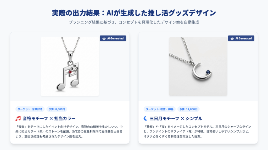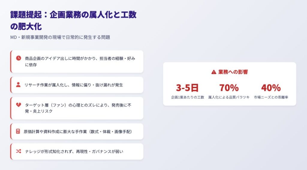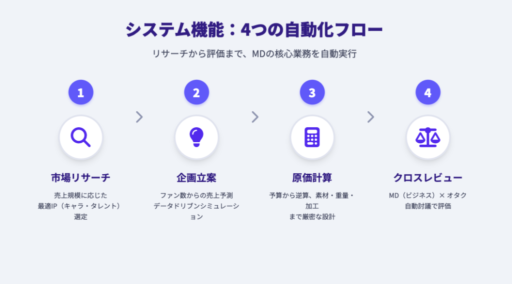 MD(マーチャンダイジング)や新規事業開発の現場では、こうした課題が日常茶飯事です。 今回は、これらの課題を**「AIエージェント」の力で解決した、弊社の最新開発事例「推し活グッズ企画全自動化システム」**をご紹介します。